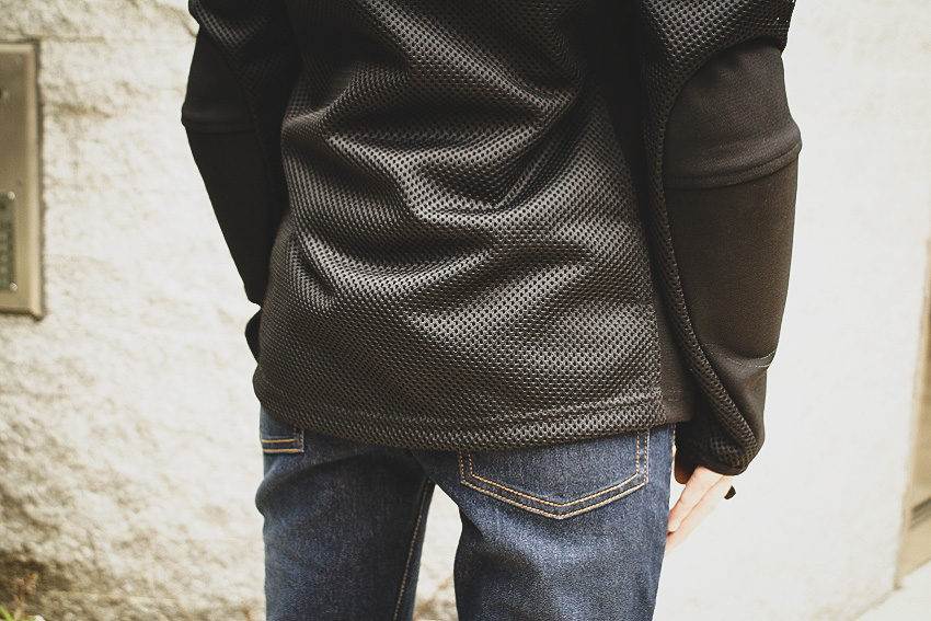 生地はストレッチが効いていて動きやすく、メッシュなので思ったよりも暑くありません。肩も違和感なく回せるし、肘プロテクターが入っているのに腕の曲げ伸ばしもスムーズです。フィット感も良く、腰回りのもたつきもありません。かといってピッチピチにピッタリフィットする程でもなく、程よい着心地です。