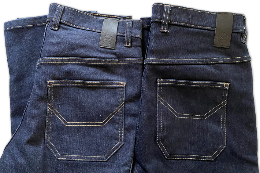 まずは大きく違うのはお値段。ブライトン19800円に対してシールド35200円です。何がそんなに違う??という話になりますが、シールドはSpectra※という特殊繊維を織り込んだ一層構造の生地であるため少しお高くなっているんですね。一方ブライトンの方はケブラー繊維の裏地補強をダメージの多そうな部分(下のブライトンの画像で黒い布が付いている部分)だけに施してあります。ブライトンはデニム自体にCordura繊維を混合しており、通常のコットン100%のデニム生地より摩耗に強くなっています。