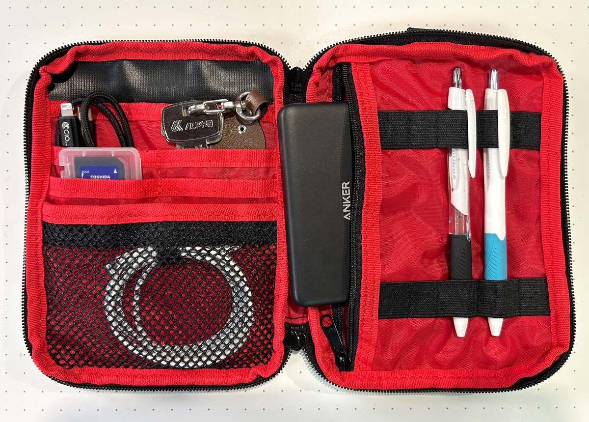 そして、特徴的なのがメインスペース内にバックルで固定されている小型ポーチで、内部がきちんと区分けされているので小物やモバイルバッテリー、各種ケーブル、それからスマホを収納することができます。
