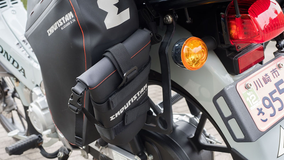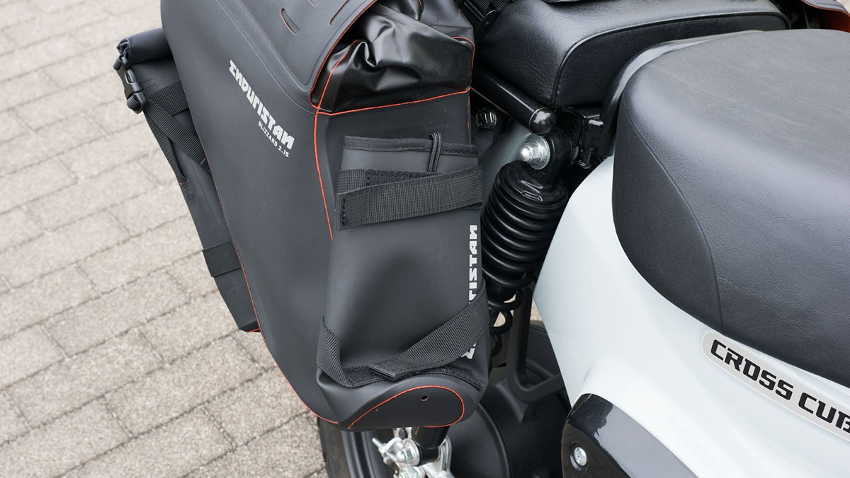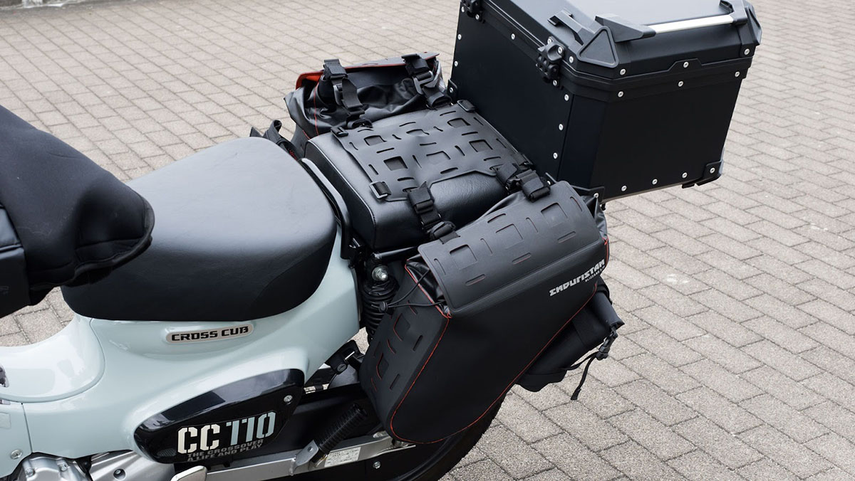 ブリザード2.25に比べると容量は10L違うわけですが、トラベル三脚などの長物も入るのでクロスカブ110のツーリングスタイルなら問題なしです。