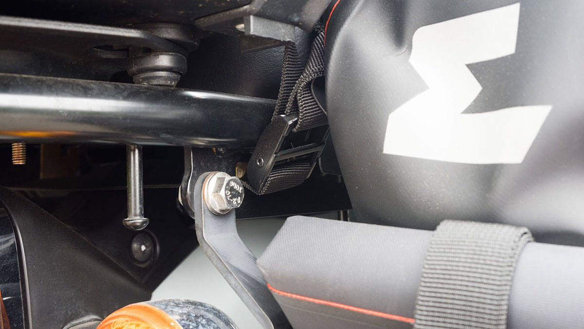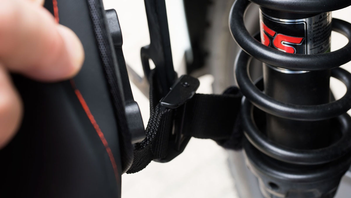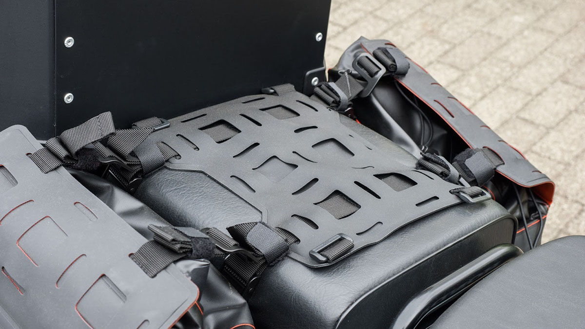 リアキャリア上には社外のタンデムシートを装着しているので、バッグを連結しているパーツをのせてしっかりテンションをかけました。