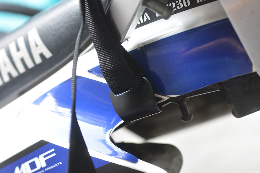 オフ車ならではのやり方ですが、前後それぞれにテンションを掛けて固定できれば引っ掛ける場所はどこでもOK。